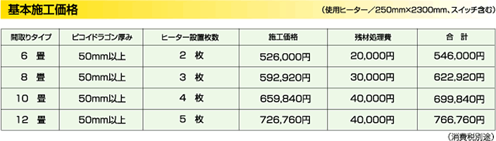 また、電気フィルムヒーター(発熱体)をピコイドラゴン(高発泡吹付け断熱)で包み込むので、発熱+遮熱+断熱の三重の効果を発揮します。発熱した熱が逃げないので効率よく床が温まります。
